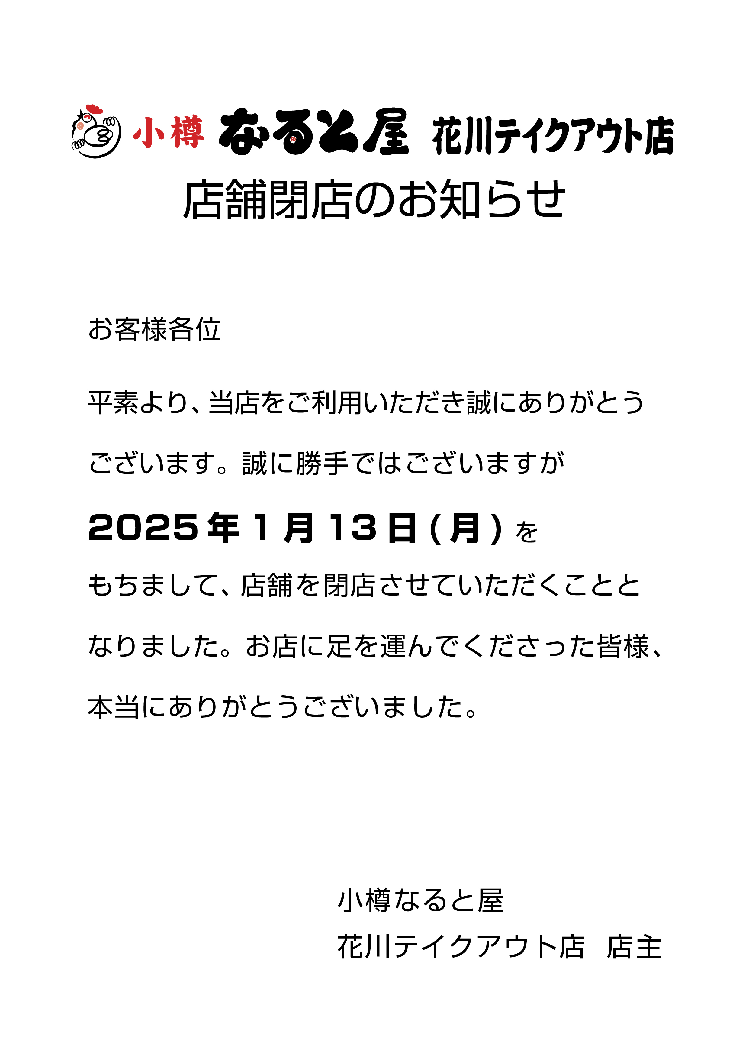 平素より小樽なると屋をご利用いただきまして、ありがとうございます。